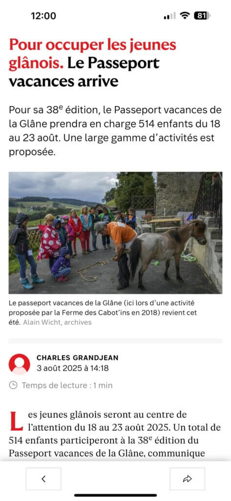 La Liberté 3 août 2025![]() La Liberté Charles Grandjean 3 Août 2025 La Gruyère 08.07.2023Passeports vacances en manque de forcesLOISIRS. Chaque été, les passeports vacances réservent une multitude d’activités pour divertir Les associations de la Glâne, de la Gruyère et de la Veveyse bénévoles et de la charge de travail colossale.